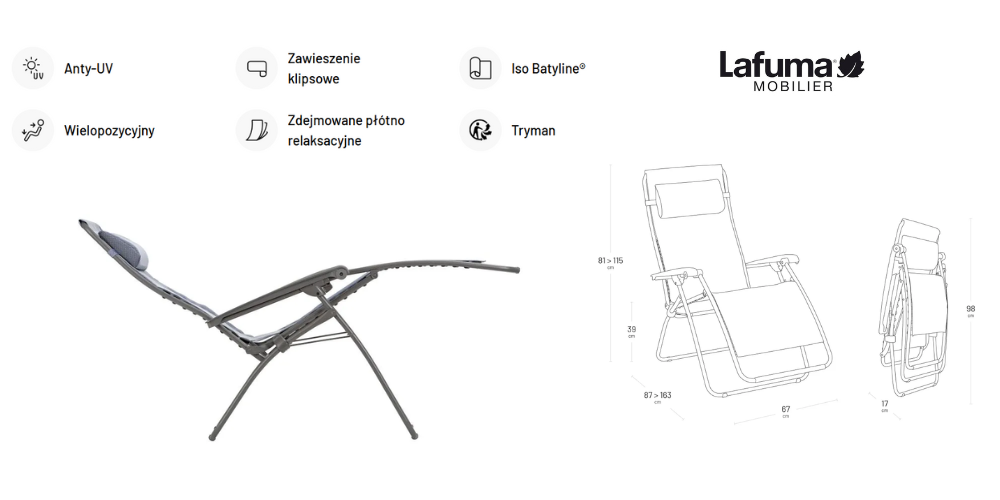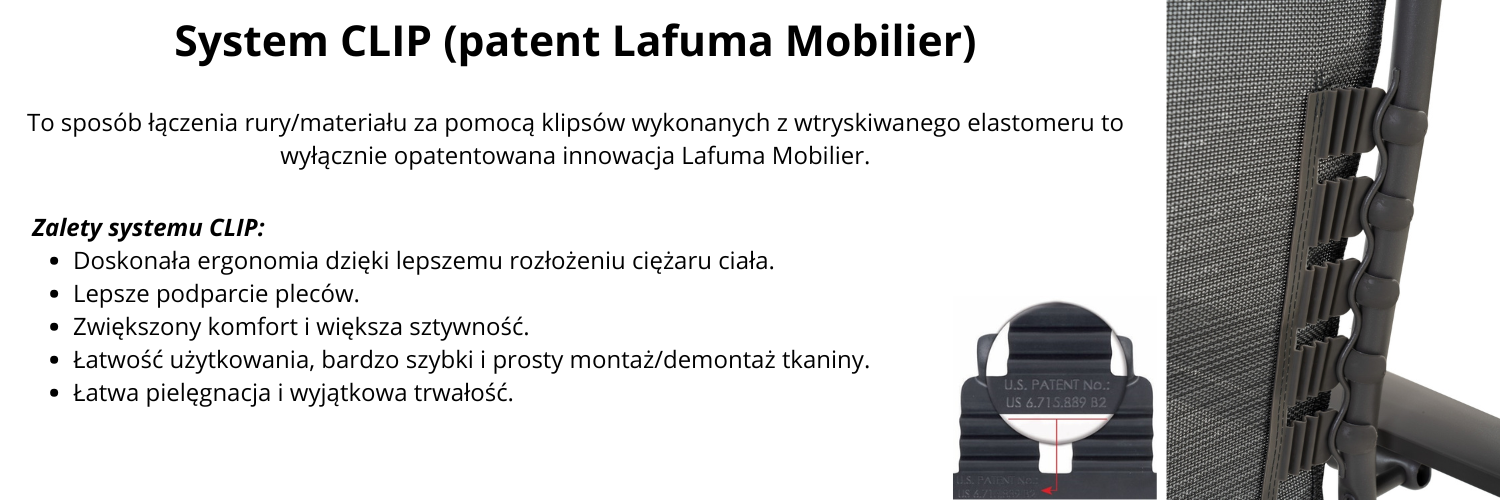 - Jego zawieszenie: stalowe rurki i płótno są połączone za pomocą elastomerowych klipsów. System ten, opatentowany przez firmę Lafuma, zapewnia użytkownikowi większy komfort, bardzo dobre podparcie pleców, łatwy montaż/demontaż tkaniny oraz dużą trwałość.