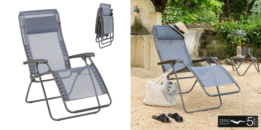- Leżak relaksacyjny RSXA Clip renomowanej francuskiej firmy Lafuma. Doskonałe rozwiązanie, do ogrodu, na taras, balkon, patio, a także na basen, jacht czy plażę. Wytrzymałość 140 kg. Gwarancja producenta 5 lat.