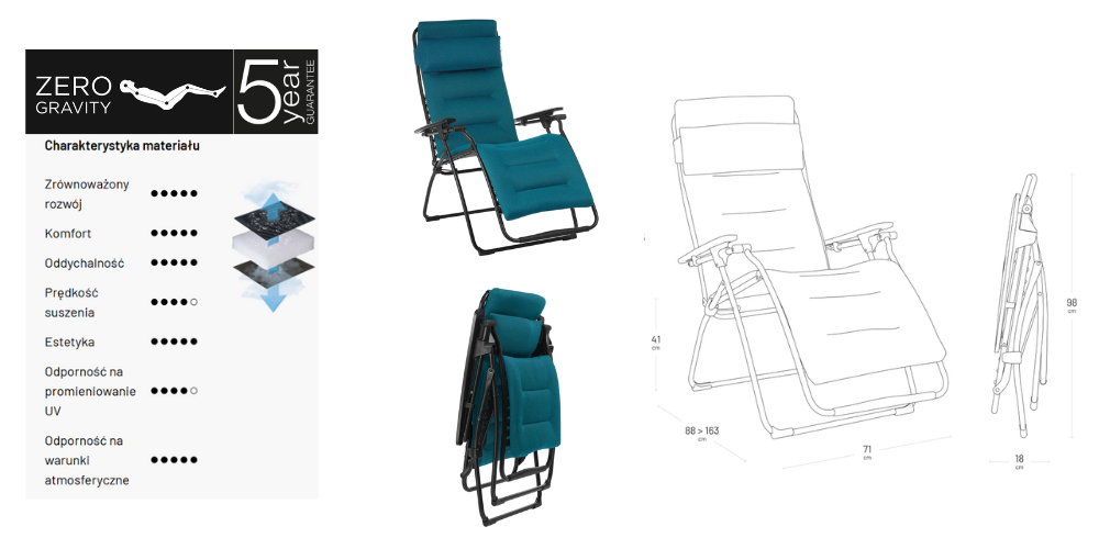 Stałe podłokietniki ułatwiają korzystanie z krzesła i dostosowanie pożądanej pozycji, w szczególności Zero Gravity dla optymalnego relaksu. Lekkie i składane, solidne i praktyczne, ergonomiczne oparcie zapewnia gwarantowany komfort i bardzo dobre podparcie pleców dzięki zapięciom sięgającym do wysokości ramion.